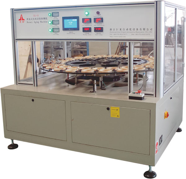 This machine is used for all kinds of motor performance testing before the dragon is the series motor, DC motor, using different DC voltage for a certain period of time the carbon brush wear aging of the special equipment.The use of circular horizontal rotary table, reducer, active conductive system, the aging tooling board, DC switching power supply, inverter, PLC controller, touch display and other devices. Voltage and high voltage three sections of aging, the last station has a current and temperature test function, the inverter control of rotating speed, sub-continuous or single-step indexing translocation, easy to operate.